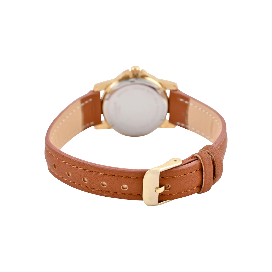 This elegant women’s gold-tone watch combines timeless style with everyday functionality. Featuring a sleek round case and a crisp white easy-read dial, it includes a convenient date function for added practicality. The soft brown strap ensures a comfortable fit and versatile look, perfect for casual or formal occasions. Designed with a classic analog display, this watch is a must-have accessory that adds effortless sophistication to any outfit.